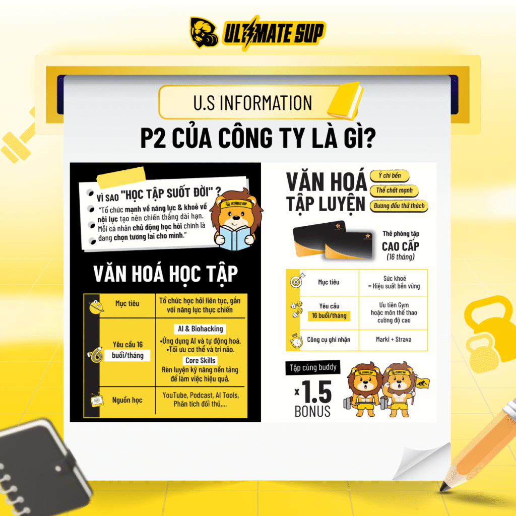 Nhưng tại Ultimate Sup, chúng tôi xem Học & Tập là hai trụ cột của hiệu suất — và vì vậy, nhân sự được thưởng trực tiếp vào khoản Lương P2 khi nghiêm túc với bản thân mình.