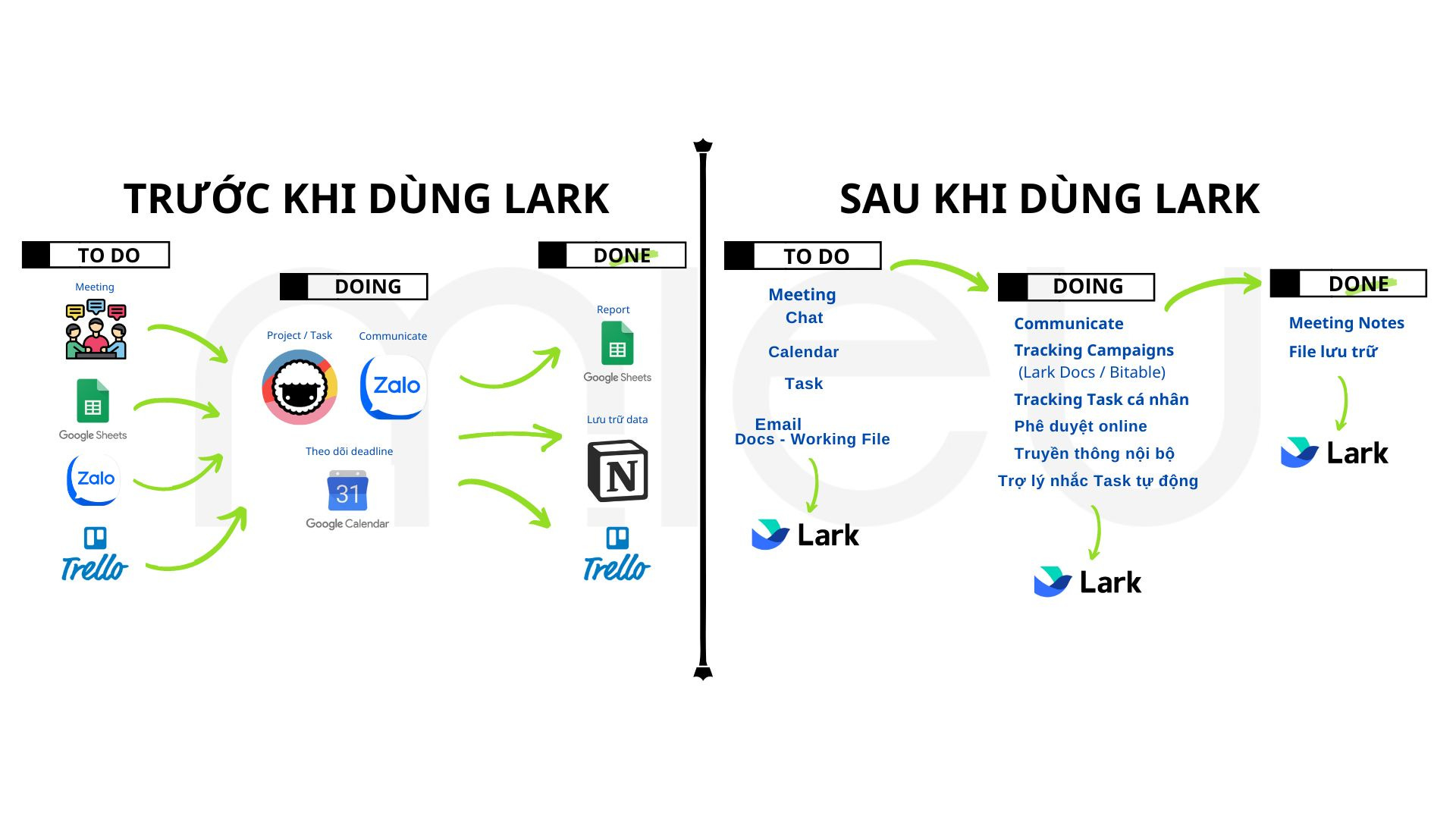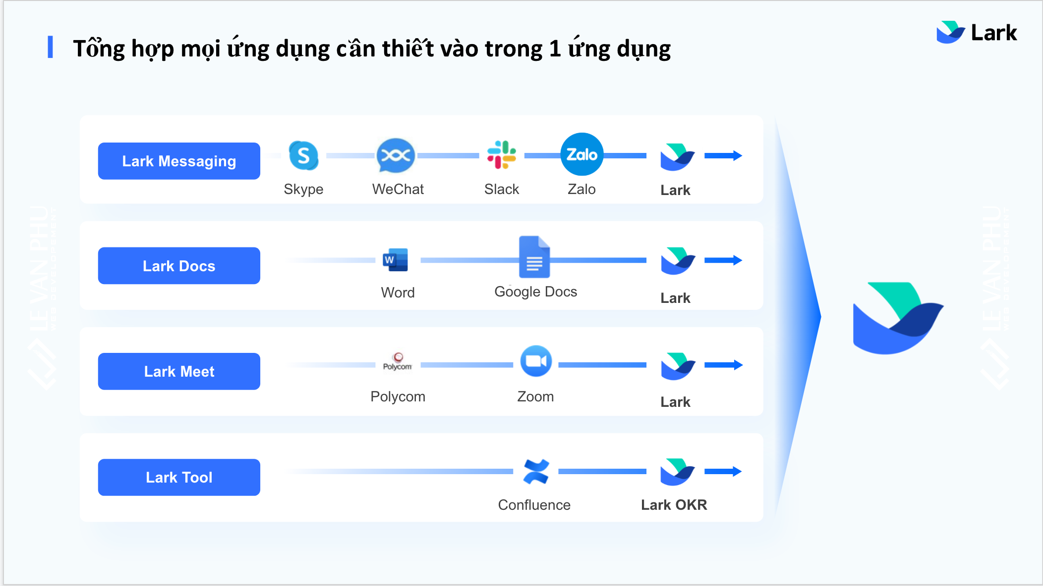 Team members log into Lark and find their entire work universe at their fingertips. No more switching between Telegram for messaging, Drive for documents, or Zoom for meetings. Lark brings it all together, streamlining communication and enhancing productivity. This centralized approach not only saves time but also keeps data synchronized and secure.